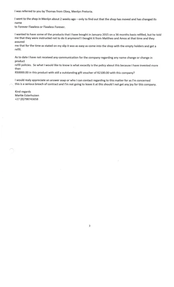 find that the Obey your Body shop was closed. On inquiry at the centre I found them on the fouth floor now trading as Forever Flawless! I went there and saw a salesperson there that I have met before at Obey your body shop on the 3rd floor and asked for my refills and redeem my "gift card" just to be told that they not allowed to give it to me anymore - new company policy! After I have made my disappointment and unfairness of the situation known he gave me the contact number of the person that handles the stock of their shops. I contacted her by email putting to her my problem and request the contact details of their head office/sales person/manager and help with it. According to the records that she could come up with there was no record of my buying the big sum of products from them. I also battle from the beginning to get information about the company from employees as every time I've been to their shop there was new people there and nobody could give or want to give you any information about management. Up to date I have not received any positive answer from any of them. It seems as if these people change names from time to time and move from shop to shop to avoid delivery on their promises!