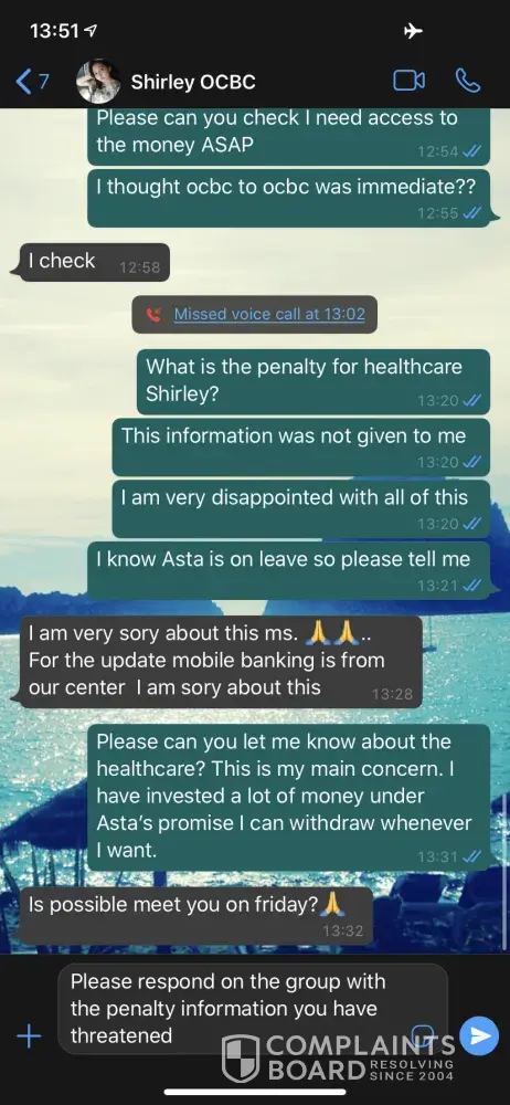 Complain to MAS please, such action is unacceptable! I have few bad experiences at Nex, Clementi and Paya Lebar. Many forerunners clearly indicated their VP, senior VPs are hopeless and incompetent, beating around the bush expert but problems solving non-exist . Either they are evasive or simply unprofessional. Wasting time only. Truly a shame to Singapore financial hub status