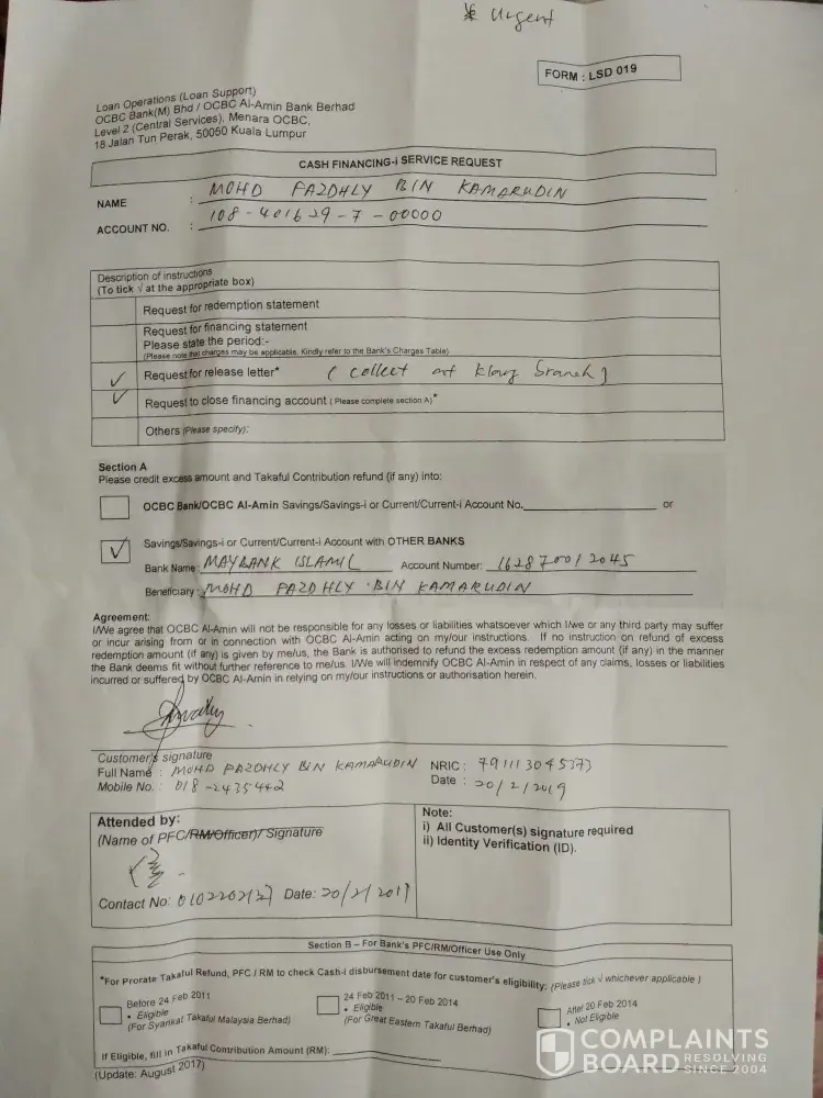 20 February 2019- Submit service request form & Maybank saving account for Release Letter, refund for excess payment & close financing account at OCBC Klang branch. The officer said 2 weeks processing. After 2 weeks still not receive any feedback from OCBC.