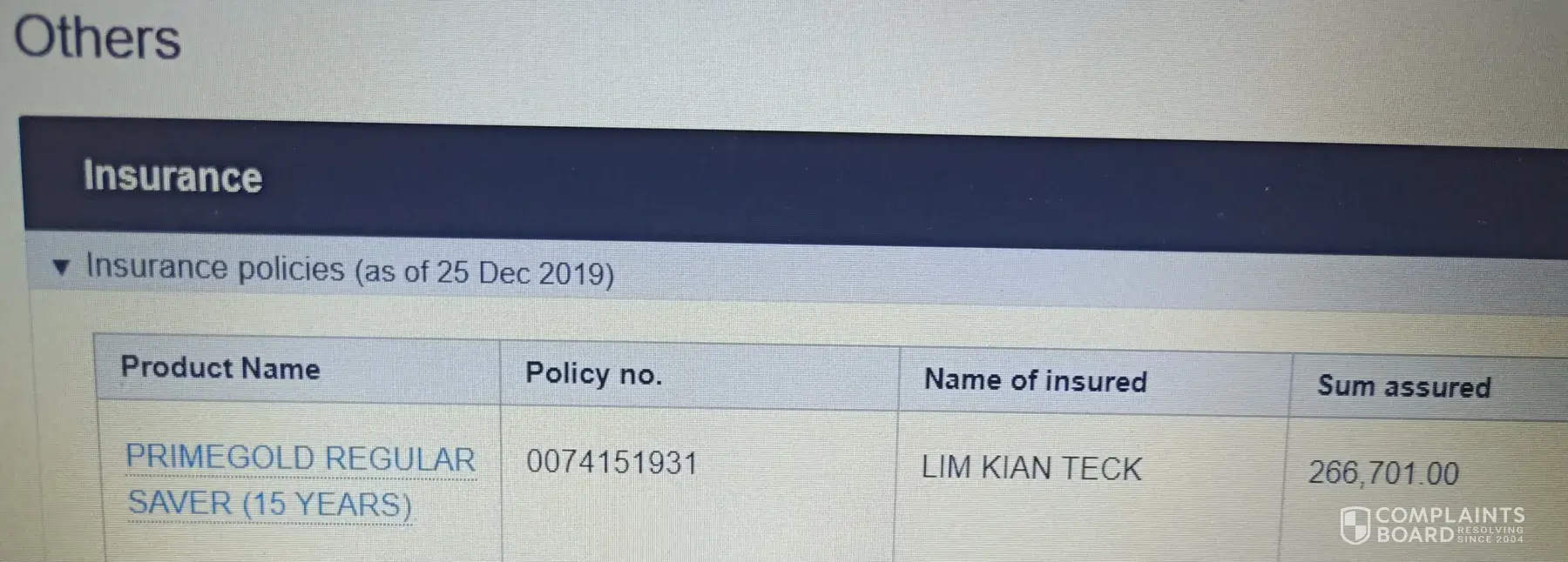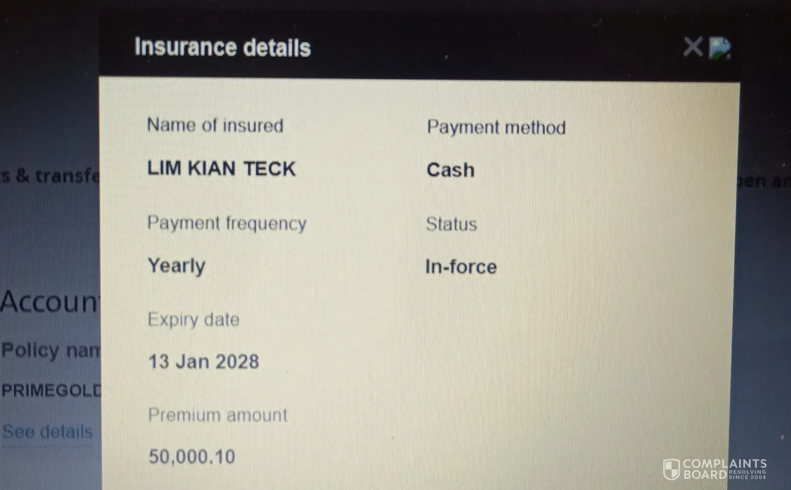 Dear OCBC Compliance officer, C/c: To whom it may concern. I happened to randomly checked my bank account through iBanking whether if my hardwork salary had been credited. I suddenly found out that there's a transaction/policy being purchased without my acknowledge/knowledge at all, or what's it all about on this policy. Name of assured: LIM KIAN...