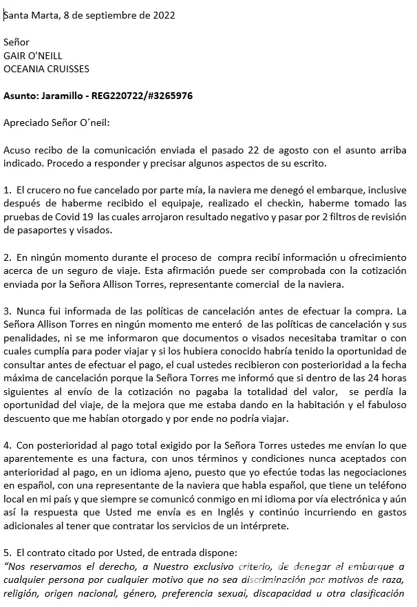 As the cruise was purchased in Colombia, and the sales representative does have a local number in my country I expected the disclosure of the terms and conditions prior to my purchase and in the same language all the negotiation was conducted.