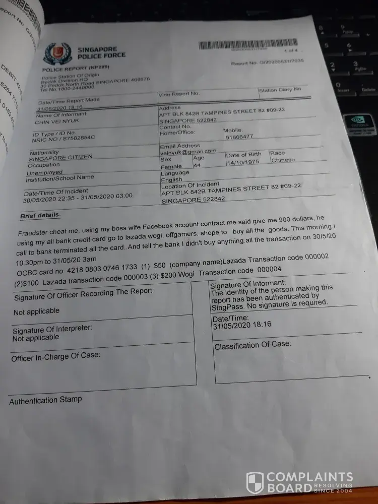 My name chin vei nyuk, fraudster cheat me using my credit card go to your offgamers buy goods, 11 item total amount $2572.31, I write email to [protected]@offgamers.com tell stop the transaction and cancel sent out the goods. I have two police report, I hope your company refund the money to the bank and bank return money to me. I was jobless and layoff, I hope your director and ceo leonard c approval and agree the money to me. I have contract your company in in k. L, the person in charge rock size and wai joe tung (don't want refund money) and also go to singapore branch 17 circular road, but don't have this company. I hope your branch in singapore help me refund the money and stop all the transaction and contract [protected]@gmail.com as soon as possible. My police report have my contract no, please help me solve this problem because I worry it till cannot eat and drink and sleep well.