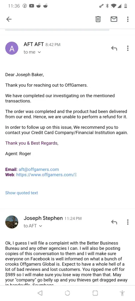Here is how Offrippers... I mean, Offgamers Global handles their business. The photos below are screenshots of their response to the theft of almost a thousand dollars from my account. Basically they think because they sold some worthless, intangible video game items to some scrub who sucks at a game and decides to rob me in order to win that I should pay for it even though the transactions were fraudulent. They say to take it up with my bank... They are nothing more than some hacker thieves, do not give them any business or kind reviews. May the fleas of a thousand camels infest their armpits.