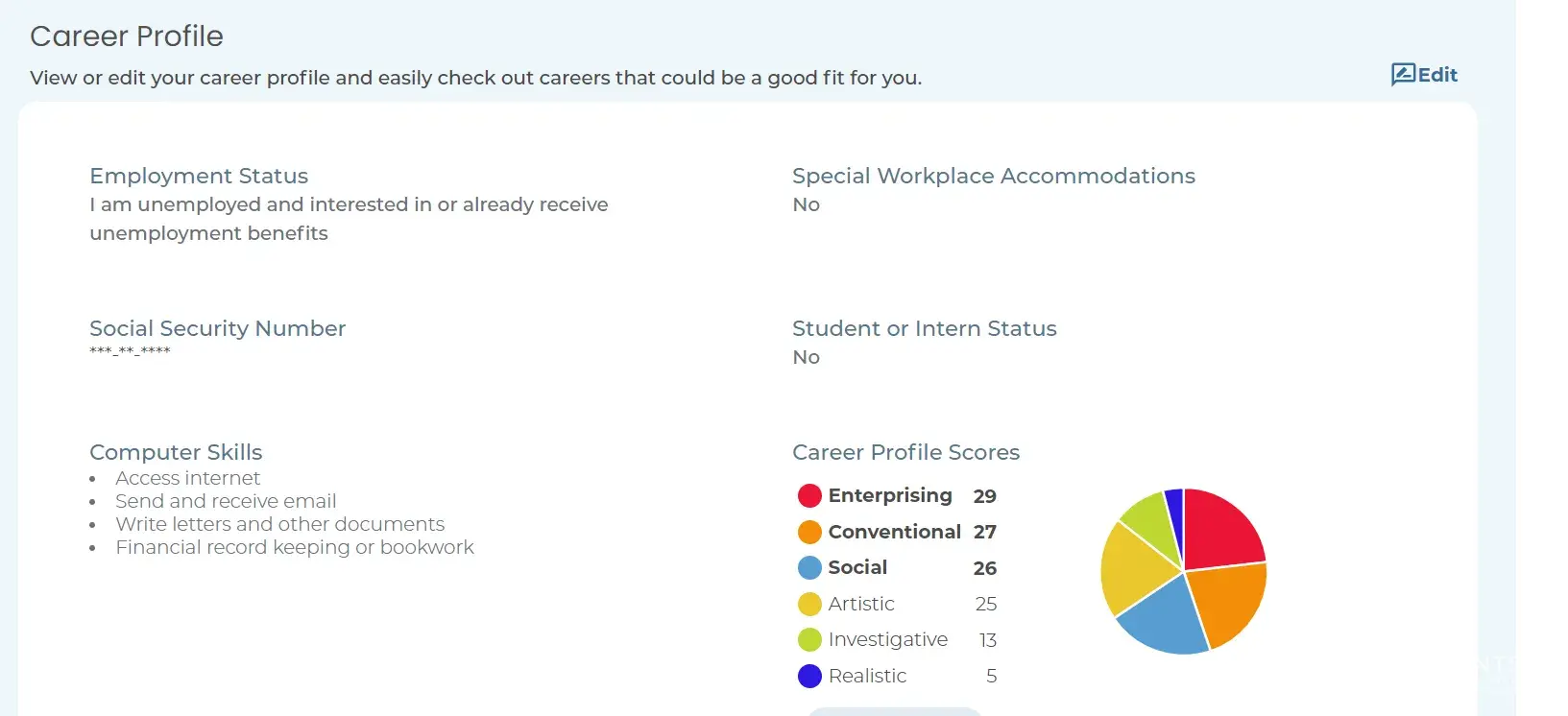 I had gone into Ohio Mean job to create a profile and did the assessment that gave me the pie chart. I know what a pie chart is. Because I used it in my 30-year career I did the other assessment at also gave me a score of 21. I then upload my resume and do not hand-input a new one on the state website.