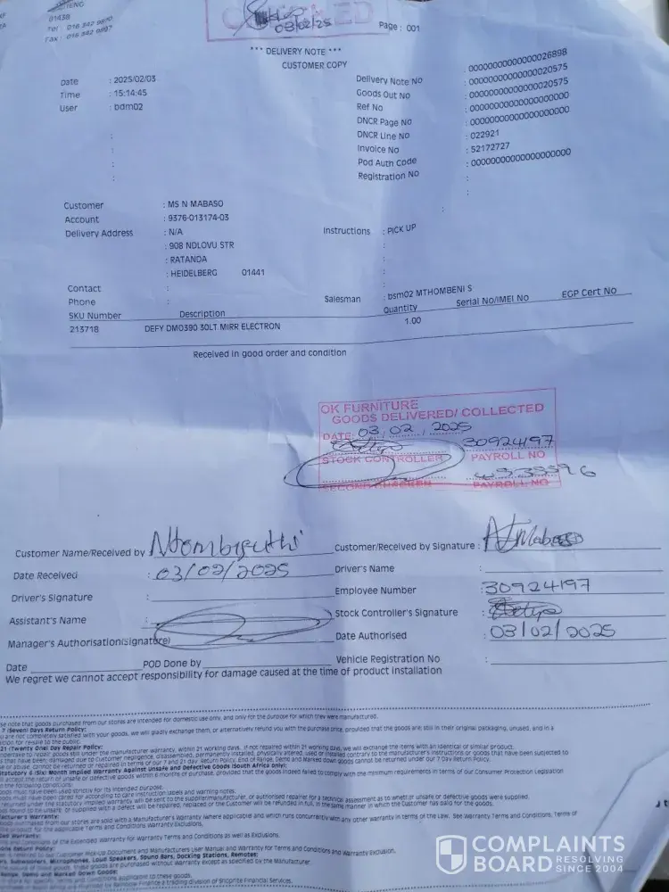 After many excuses OK Furniture came to fetch the deep freeze at my house mid-January. Once again, I phoned and phoned. About a week later Emily called and said the supplier has fetched the deep freeze. This did annoy me as I was told the supplier would come and fix the deep freeze at the store. They just fetched the deep freeze a week earlier in the hope that I'd stop calling.