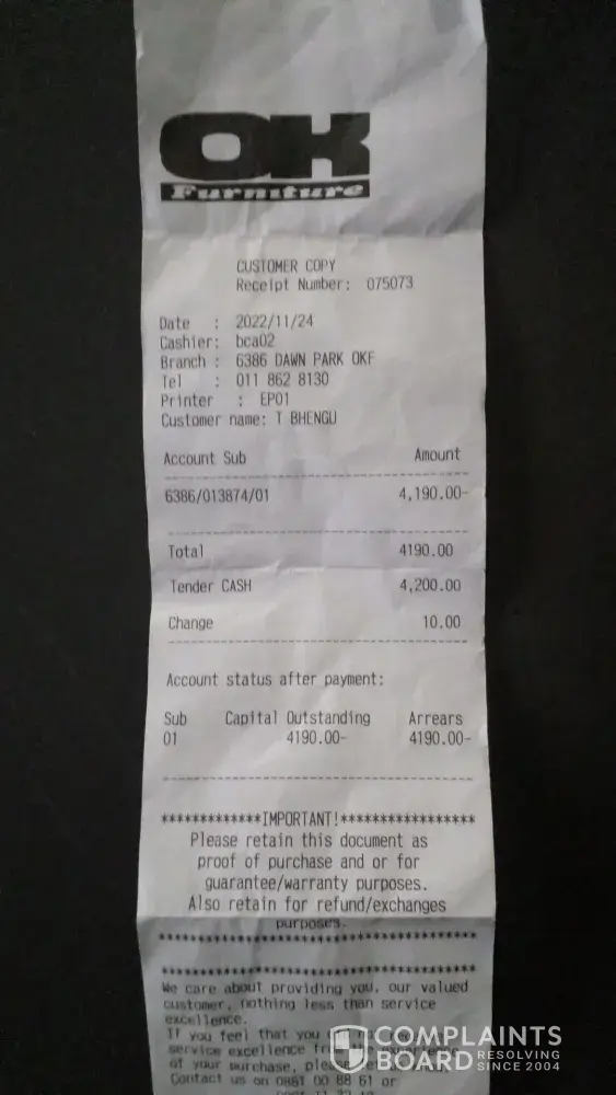 I have since lay bought a wardrobe at OK Furnishers Engcobo branch, a month ago it was on special and the sales lady called to ask if I will not be able to settle it, which I did. She told me that it will be delivered before the 20/07/2022 but I have not received my wardrobe as yet. Can you help with this.
