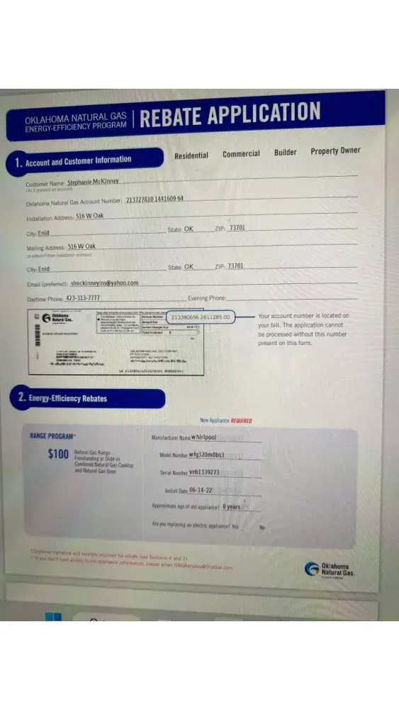 I am new to Oklahoma. I purchased a home. Oklahoma Natural Gas replaced the gas line from the Street to the house. After completed I replaced the electric stove with a gas stove. I sent in the rebate form and receipt. I have followed up monthly since July 2022. I have been told my rebate form was received and will be reviewed.