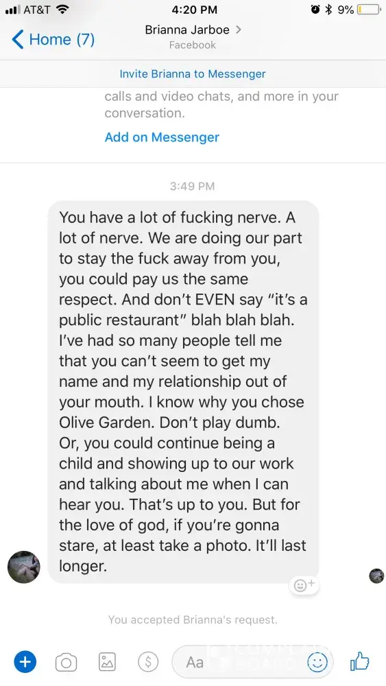 My friend and I went to Olive Garden today (8/7) because she has been craving it and she hadn't had it in like 6 or 7 months. There is a bartender, Charlie Osborn, and a server, Brianna Jarboe, that we do not get a long but we just wanted to eat and had no plans to talk to them. We actually thought they weren't working so we figured it wouldn't be a problem. When we walked in, we saw Charlie at the front in regular clothes and we didn't say anything to him. Just walked by. Once we were sat, we saw that Brianna was working. We didn't say anything to her either. My friend asked if that was Brianna because she had never actually seen her in person and I told her yes. I can't see things very well when I'm far away so I had to squint and stare for a second to tell if it was her. We then just sat and ate salads and our appetizer. When we were working on our actually meal, I received a theartening and unnecessary message from Brianna. We hadn't talked to her or Charlie the whole time we were there and didn't try to provoke them. We just wanted to be normal customers and eat Olive Garden. I think its unreasonal to expect people to not come to a restaurant just because you don't like them, especially in a small town like Stillwater, where there's not a lot of food options.
