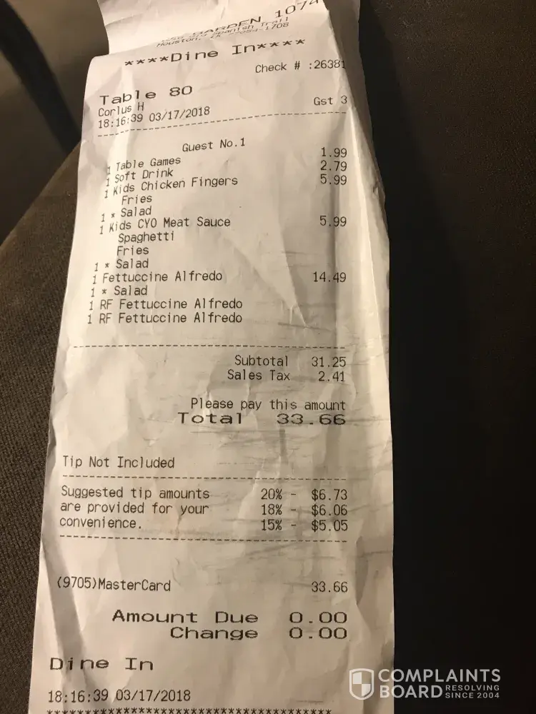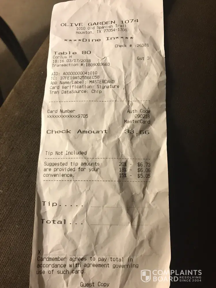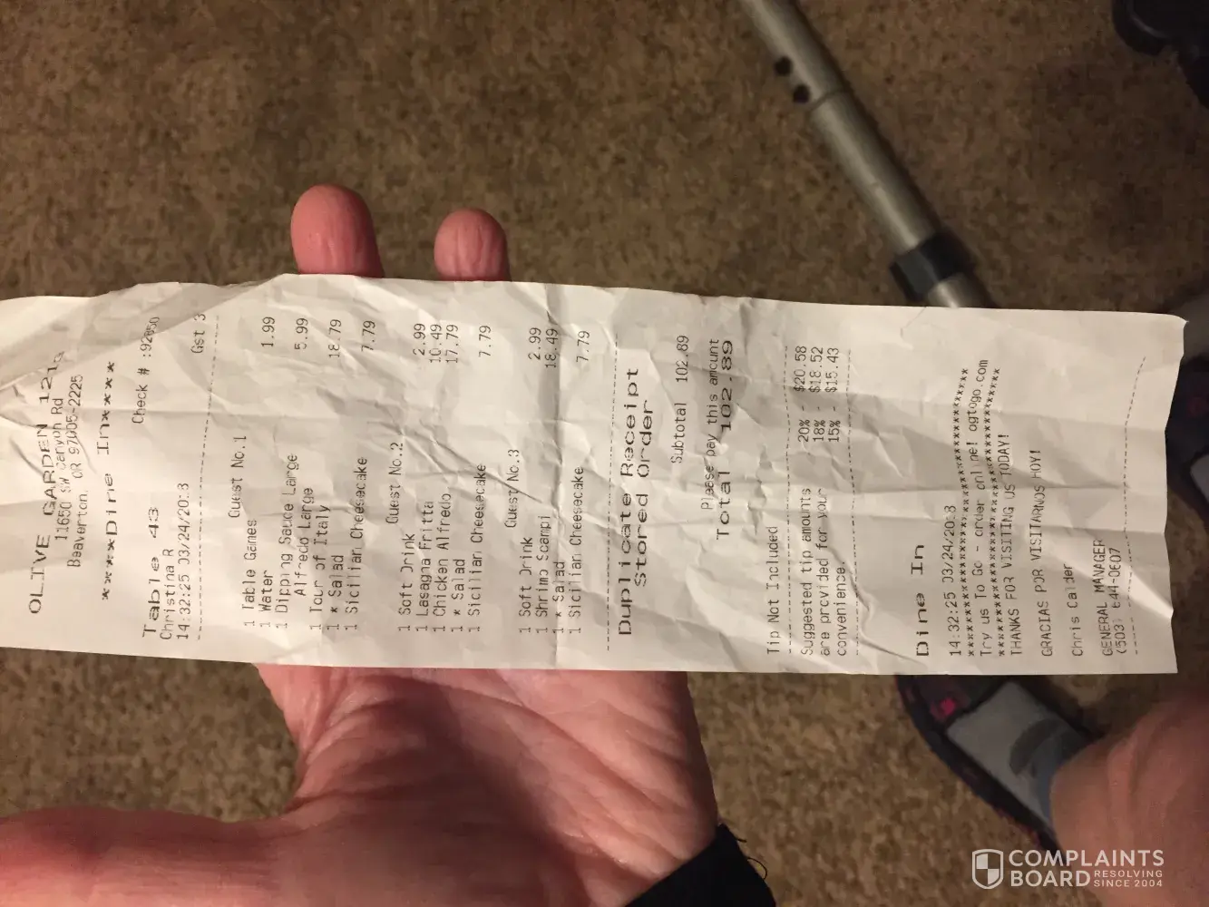 My email is [protected]@gmail.com my phone number is+[protected] I am hoping somebody else would contact me ! Horrible service in Beaverton Oregon and then after complaining you would think I would get a response still waiting ? Thank you Lori Clark check# 92850 Table 43 14:32:25 03/24/2018 Olive Garden 1213 Dine In
