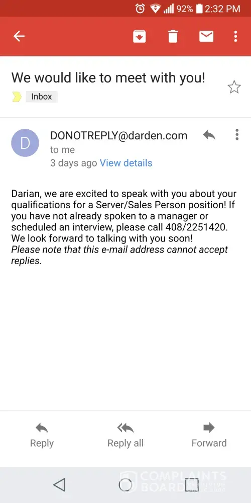 Hello, I was recently contacted by email to call and set up an interview. I worked for different Olive Garden in San Jose about a year ago. When I called in the GM said that he would call the other Olive Garden to verify that I work there and then he would call me back, I haven't heard from him and I want a fair interview just like everyone else. For them to just not say anything makes me think that I did something wrong. I left Olive Garden a year ago to have a serious surgery and I had some memory loss. I am now recovered and wish to go back to this company since Olive Garden was the best restaurant I ever worked for. I am just asking for some transoarency. If there is something I did wrong then I would like to be told that, not be ignored. Management needs to keep their word. If they say they will call me back, then they should do so. The email clearly states to set up an interview.