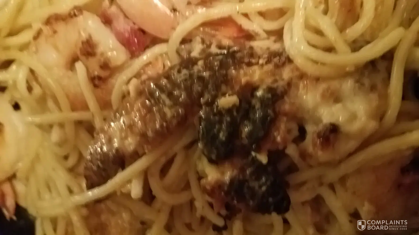 (On 10-21-2017 around 18:00 my husband ordered shrimp and scampi dish when he started to eat he saw that there was something very hard that he could have chocked on it (photo attached) he called the waitress (Amy) and she said that they had other complaints like that so she called the manager (Pam) which told us that they were looking for an other company to buy their shrimps and tried to explain. My husband said that it is dangerous to choke on this but it did not seem to bother her and that she will tell the cook. I think that they should not served a disk like that somebody could choke and die. Please let me know what you are going to do about this. I tried to find the head office phone number but I could not find it.
