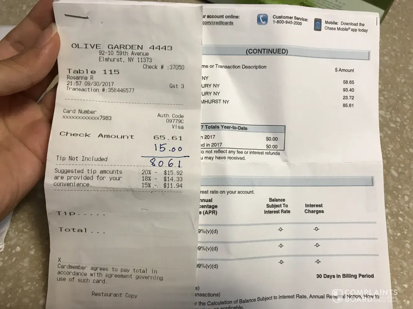 On September 30th, my family and I dined at the Olive Garden on 92-10 59th Avenue Elmhurst, NY 11373. My mother loves Olive Garden so we decided to go to the one near us is Queens. Upon arriving, we were told the wait would be 45 minutes to an hour, which was understandable. We didn't have a problem with it because we know Saturday night is always busy in any restaurant. However, we didn't even have to wait long because we were seated within 20 minutes. This was when our night sort of went south. Our server, Rosanna did not approach us until 10 mins later. She took our orders and tended to her other tables. We were not offered bread and salad nor did we get water. I had to flag her down to get her attention so she can bring the stuff out. Then our entree arrived. We were confused because for one, we had ordered appetizers to start, and they forgot to bring it out. Then, for my entree, I had asked for grilled chicken with my pasta and they also forgot to add that. When I flagged Rosanna down to let her know, she played dumb and shifted the blame to "What? They forgot to bring that out for you?" And "What? They didn't add the chicken for you?" Instead of blaming other people, she should have checked before serving the food out. It is her responsibility as a server to check. I have worked at a corporate chain restaurant before, so I know that this type of service is not acceptable! On top of the horrible service we got, when she finally brought the side of grilled chicken out, it was barely cooked. I was appalled. I told my younger sister to not eat it because she could've gotten salmonella. So instead, I asked the server to bring me out another plate of pasta, but this time with breaded chicken. She came back with grilled chicken and told me she was not able to punch in for the breaded chicken because the system would not allow her to. At this point, I was dumbfounded. My family just wanted to get out of there because the service was horrendous. When we got our check, my mother even generously tipped her 20% for her crappy service. HOWEVER, when my mom received her bank statement in the mail, she saw she was charged an additional $5 to the 20% we tipped the server. That is unacceptable! How can you guys allow a thief to be working in your company? As if 20% wasn't enough? We went to the restaurant where we ate and spoke with a young manager yesterday, October 13 and told him the situation. All he did was returned us the $5 and told us he was sorry. To me, and my family, that is not enough for the trouble we went through. This is why I am reaching out to you guys because something has got to give. Please respond to me at your earliest convenience. I've also attached photos of my receipt and credit card statement.