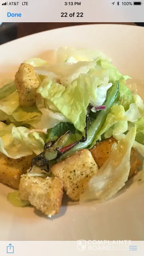 Yep. I just left and got a green critter in my salad as well. Wonder if there salad supplier isn't cleaning it well. I'm a little queezy but still ate the fresh bowl they brought me. Ate it a little slower and carefully watched my bites though. Got about a $15 discount as well. Works for me. I gave our waitress $10 from a now $15 bill. Wasent her fault or the restaurants. [censored] happens. It could be worse like a cockroach.
