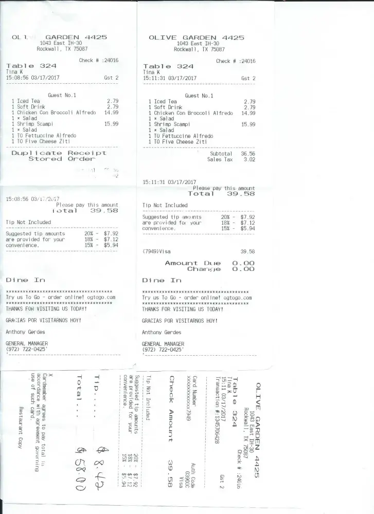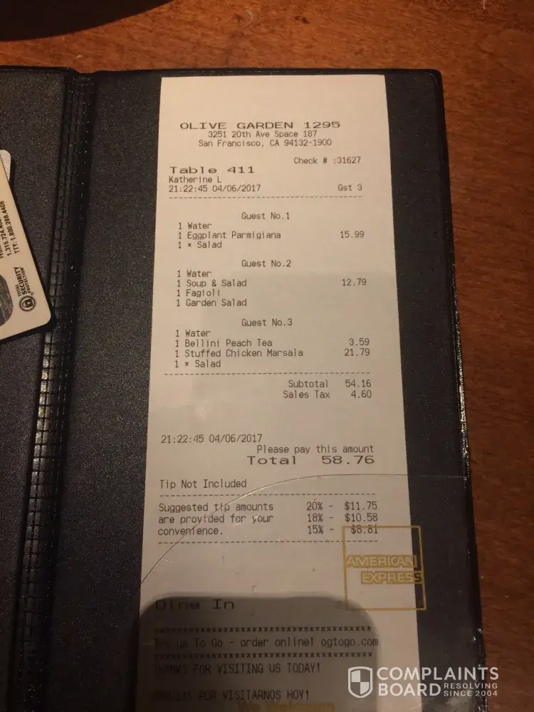 On March 10th, 2017, we went as a party of 4 for dinner to celebrate my birthday. My whole family loves Olive Garden and have been eating at Olive Garden locations for about 17 years or so. Never had a negative experience. I had called and made a complaint and was told someone would get back to me. I never heard from anyone. I am looking for the receipt which is in a stack of papers somewhere. The bill was around $86.00. We ended up leaving and paying the bill and went to another restaurant for dinner that night.