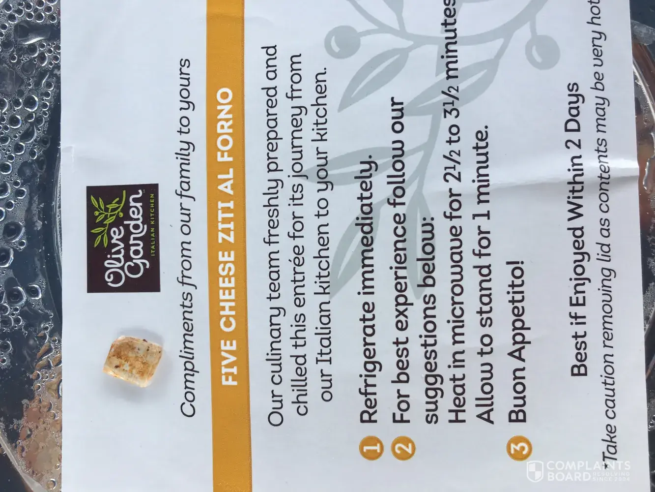 I visited your Kissemee location yesterday evening with my family and group of friends we were vacationing with. We took advantage of your buy one take one offer. The service was excellent the food in the restaurant was great we all had a fabulous time. However eating my ziti noodles today from my take one meal i bit into a fair size piece of glass. This was very upsetting, and extremely alarming. Not the way i would have chosen to end my vacation in Florida. You shoud take better precautions in preparing your meals to go. I can't imagine how more upset i would be if it had been one of our 4 children in our group of 8.