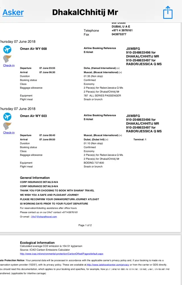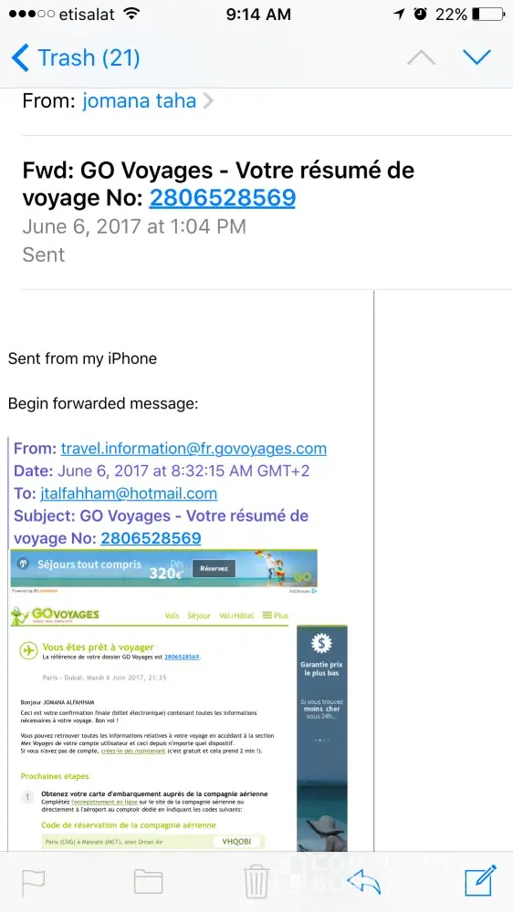 When I came to Dubai, I saw through my bank statement that you take two times the price of the tickets. Once from Oman air and the other from Go voyage?