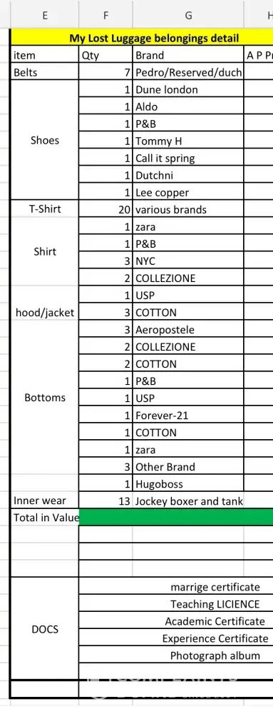 List of my items are listed as I can not remember all the item but I have mentioned all the item details which I can remember. really horrible experience with Oman air and I wish even my enemy should not be treated like this. So far no call confirmation from airlines. isnt it is strange. I am literally having tough time to get my luggage back as I have my all belongings and some important documents like marriage certificate/academic certificate etc were there which can not be compensated or reproduced at any cost. Hope someone will revert back to me