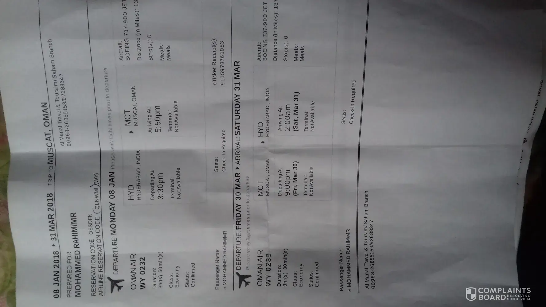 I, along with three other people, had an economy flight from Kathmandu to Muscat (going onto London) on the 12th April 2018 number WY336T.