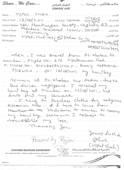 I was travelling from Al-Khobar (Saudi Arebia) to Mumbai Via-Muscut, my hand bag missing due to Bus driver nigligence.My history known to Oman Air official Mr. Fahad at Baherin air port, he guide me to do the complain by mail.Herewith I am claiming for as below-