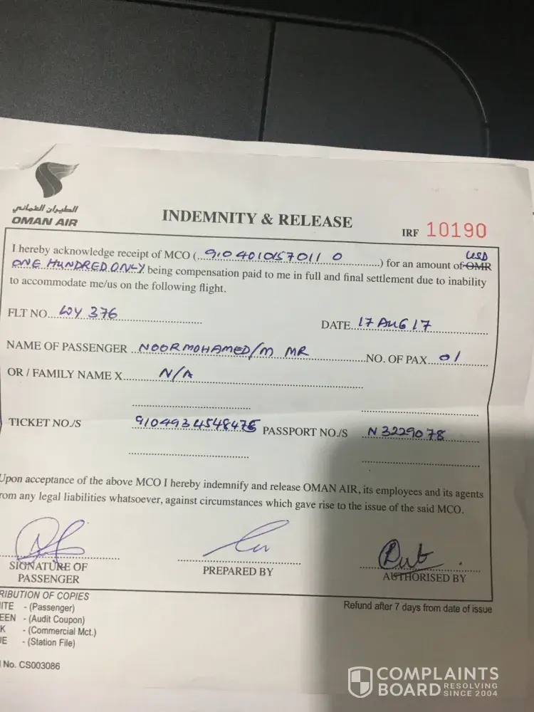 I submitted the letter with oman air card payment authorization form with duly signed along with my passport copy, ticket details as mentioned below.