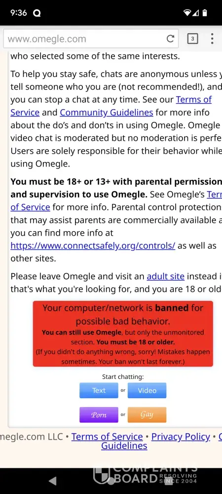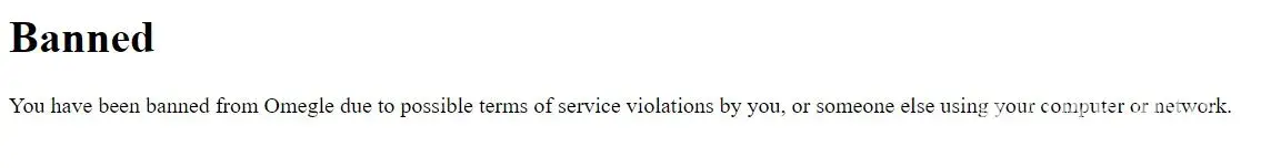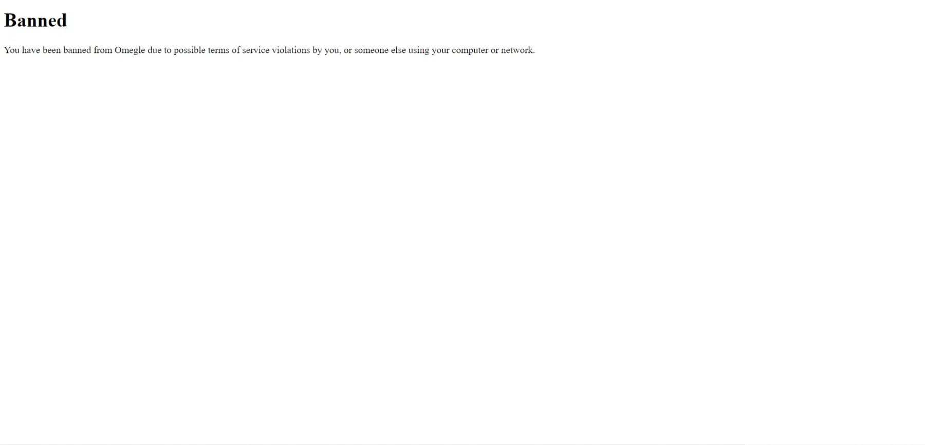 I looked it up and it says you get this error when getting banned? I have been on Omegle 1 time for 10 min and I did nothing I can think of to get banned am I banned or is it a glitch. is there a way to see why I'm banned? I've tried to do everything I can and I am scared to use a VPN because it says trying to avoid a ban it's against their terms of service but I'm not sure if I'm banned or not