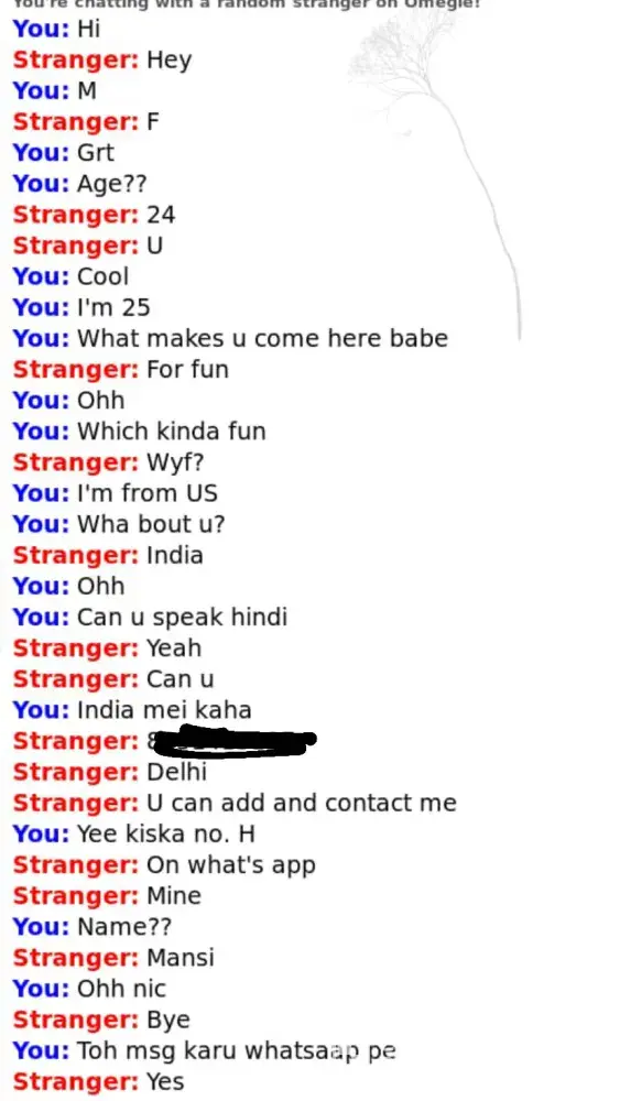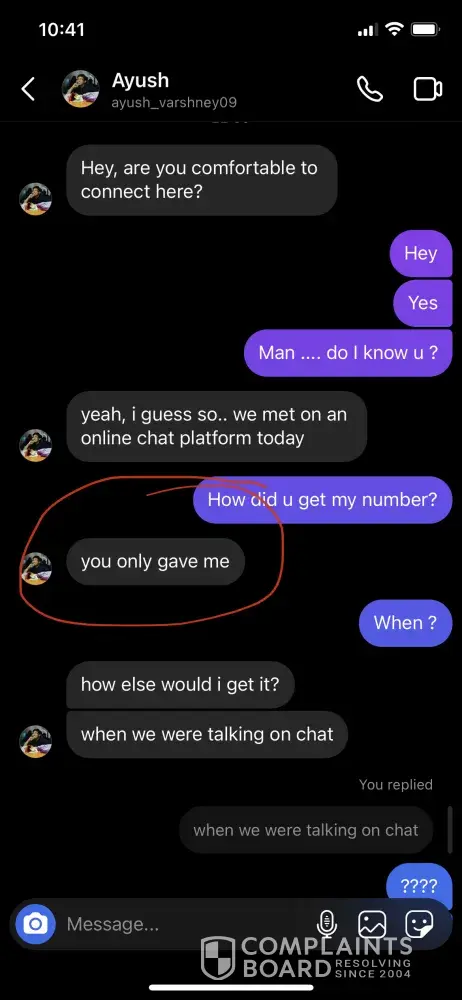 I got a text from a guy saying that I got your number from omegle. Few months back 3-4 random guys texted me saying they got my number from Omegle. I don't use omegle, I've never used the site. A fake is leaking my number to everyone. The person is chattinf with my name, Mansi, and says that she's 24. She/he is sending vulgar texts to strangers and telling them to text on my number on whatsapp and telegram. Kindle resolve this as this is a matter of privacy.