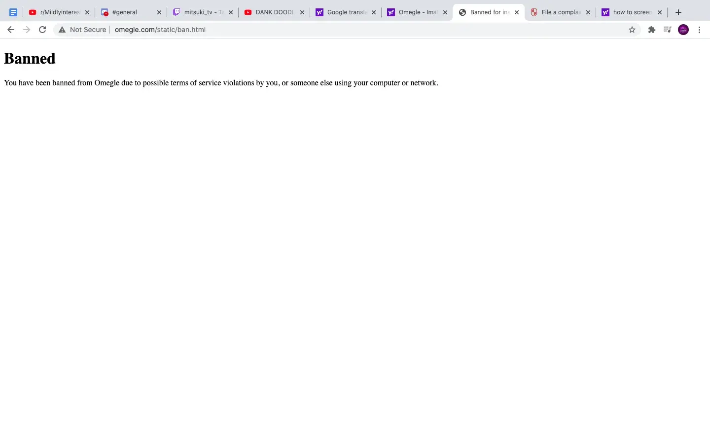 ive been banned again and all i was doing was my hw while on omegle i didnt even do anything wrong and its crazy because people show their private areas and people are racist but you chose someone who didnt do anything