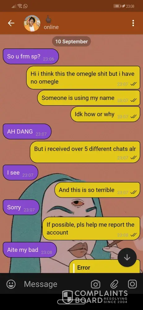 I have recently received men sex chatting me on Instagram, telegram and sending dick pictures on Snapchat. All of them said i texted them and have told them I am horny on omegle. However i have never once visited omegle nor knew of its existence till now. I even changed my Instagram and telegram account however still received chats. I am not sure who or what is using my names across all the platforms but please look into it. The men who realised that they have been talking to someone else have agreed to assist me in reporting this person, so please do look into it.