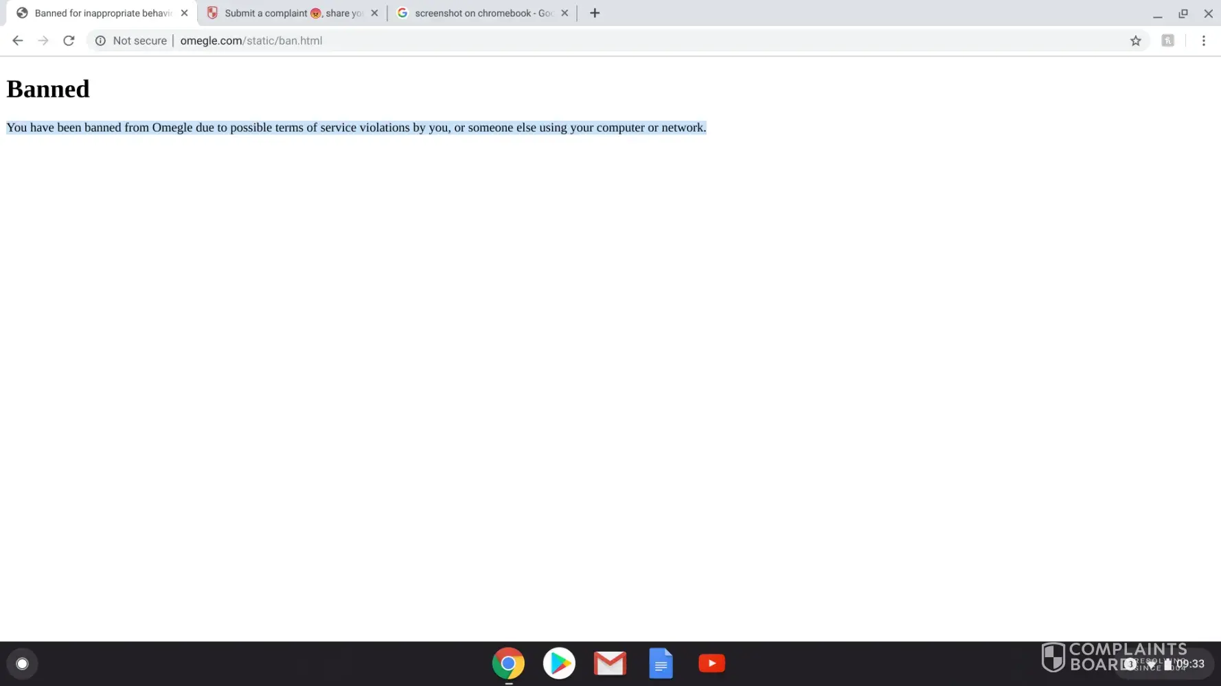My friends and I were on omegle, we were not doing anything bad. We were being family friendly and nice. We randomly got banned when we didn't do anything to get banned in the first place. It would be great if we can get unbanned as soon as possible. This greatly upsets us. This unsatisfactory experience has frustrated us and caused us annoyance.