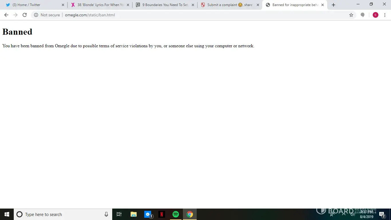 I just wanna be unbanned if that's possible, because I didn't do anything and I'm bored so I want Omegle please. Also I'm annoyed that my complaint is too short like I just want unbanned and you're making me write an essay about it this is annoying and I kind of regret even trying to complain but I've committed now so I'm not going to stop. Just please unban me, how hard could that be, just unban my laptop and get on with your day my dudes