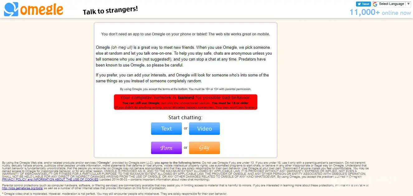 Hi I've been using omegle for years, recently when I was bored, I straight up switch on my laptop and open omegle website but I dont know why when I go to omegle websites it saying on the page that my network/computer has been banned for possible bad behaviour. Im using omegle is because im searching for new friends worldwide and just enjoy having a good conversation with them there, I really like to be on omegle websites.