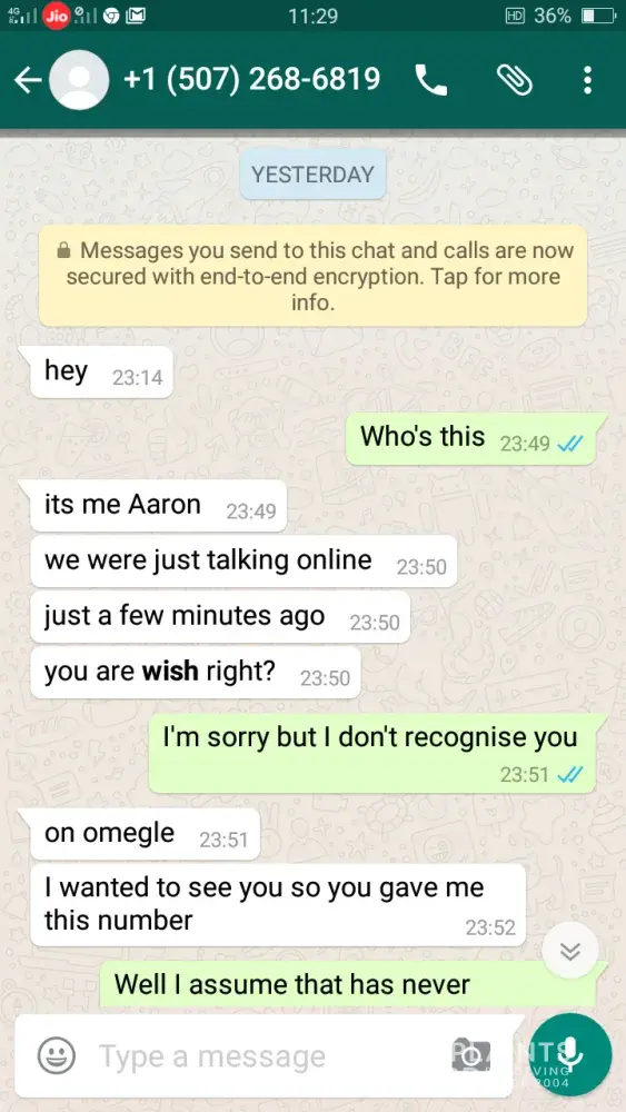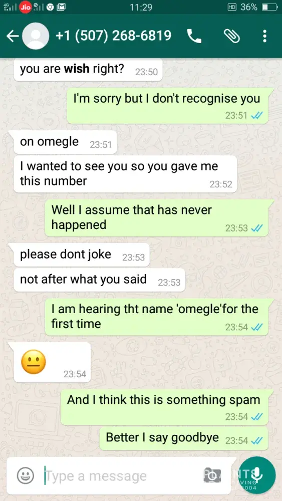 Hi, this is Vish Kassere. Yesterday, June 30th, 2017 11:14pm I received some messages on my Whats-app from a stranger claiming that I have talked him on Omegle and gave him my number for further interactions and I was shocked to know that someone whom I don't know is saying I met him on a platform whose name I heard the very first time in my life. )refer the attached screenshots. At first I thought it must be a scam later on after blocking the person I searched for Omegle.