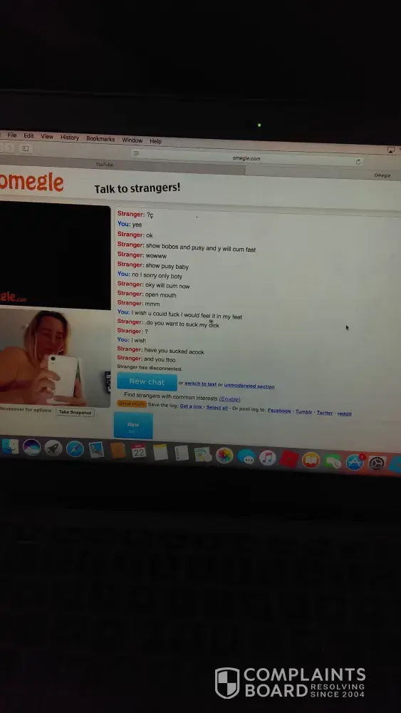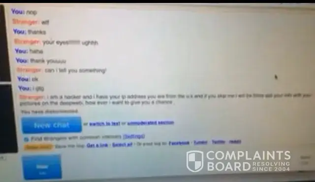 I was just casually browsing the Omegle video chat when this person with their webcam turned off began chatting with me. He stated that he had taken a video of my face and threatened to post it to a pornographic website. He told me that if i didn't want my face on these sites, to squeeze my breasts together (initially without a shirt, but I convinced him to let me do it with my sweater on). He had once again taken a video of me doing this, and continued threatening me, that I had to stay on the chat and do what he said or else he would upload it. Of course I begged him to stop and didn't do anything more with the fear of once again being recorded, but he decided to be a perverted freak and continue to threaten me. The catch is, I am under 18 years old and this guy and any porn site can be reported to the police for child pornography If they have this video of me. This was totally involuntary and I was being threatened, and I couldn't find an Omegle complaint site so I found the closest thing to it. If anyone finds a girl squeezing her boobs together through a sweater that says "I don't play the field, I rule the sidelines", then please report it to the site and get it removed. You and anyone who sees that video can also be charged with child pornography.