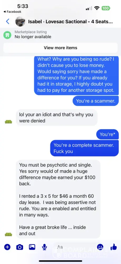 I was scammed out of $100 on Facebook Marketplace. The seller was “Sam Smith†and he requested that I Zelle him a deposit of $100 for a couch I wanted to buy. There was no agreement that the deposit was non-refundable, so the assumption would be that the deposit is refundable. I found red flags all over this person’s account and asked for the money back. The person excessively insulted me and refused to give me the money back. He sent me a screenshot of my own account seemingly in a way to intimidate me that he had my information. This group or person is an absolute scammer!