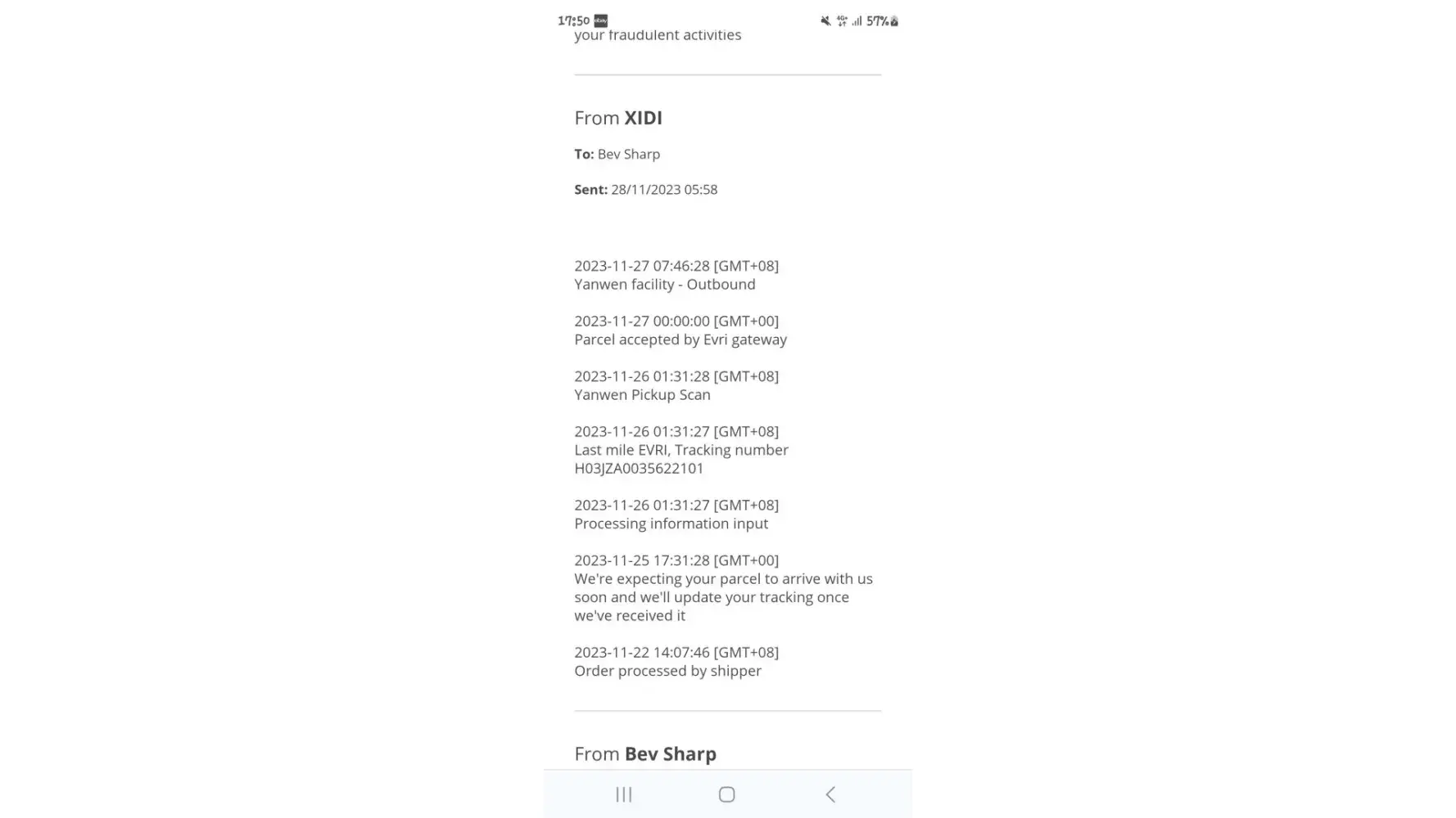 I ordered a mobile phone that arrived on 17th November 2023 under evri tracking number H03JZA0035622101.