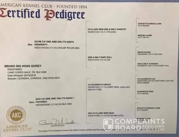 One and Only's Cane Corso's are certified pedigree dogs, all of their bloodline has ‘One & Only's' in front of all their dogs names, so you can see their history with AKC. For example, they have One & Only Baby Doll or One and Only's Highly Favored. They also have the initials GCHB, GCH, or CH in their dog names. I'm telling you every way you can recognize if you have one of her dogs. If you buy a dog from this breeder, you're encouraging her to continue to breed aggressive dogs and you're putting yourself, your family and your friends at risk. The breeders names are Leondra, Chrissie and Rain Rew.