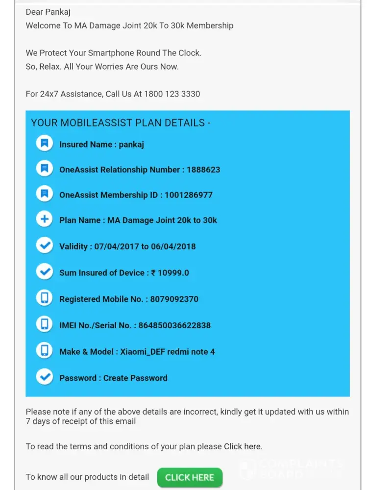 For the purpose, I send them an email at '[protected]@oneassist.in' on the same date (13/july/2017 at 4.39pm) stating my complaint but so far have received no reply on their part. Immediately after my email, a computer generated auto-message was received to post the query through my registered email ID. How would I be able to post through such ID when I am not a registered customer.
