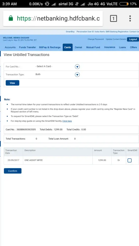 I received a message on 13/07/2017 at about 8.30 am that my one assist service has been activated and my service relationship number is 2373248. Subsequently, at about 04:17 PM the same day, I received yet another notification that my HDFC credit card has been debited to Rs. 1299 towards One Assist MFEE.
