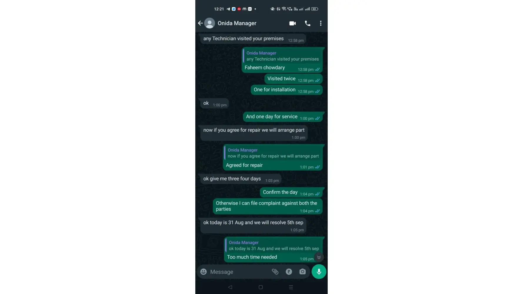 Air-conditioner 1.5 tonnes, purchased on Jan 14, 2008, stopped effecting cooling. Reported to Onida service center. A technician came in to confirm the complaint and took away Rs.400/- No receipt was given. When checked with his superior, was told that he had forgotten to bring the receipt book! After repeated follow-up the machine was taken and returned after 15 days, and conveyance Rs.400/- waterwash Rs 700/- gas filling Rs 2, 250 was collected. Within two days, the machine had promptly stopped working. on 21.4.2011, vide complaint no. [protected] was lodged. Earlier job no. 80524. No action is being taken till date. Will the authorities wake up from the deep slumber sleep, as the mercury is soaring 42 deg. If they are competent to handle, they should refuse in the first place, so that we can take the help of road-side mavericks!