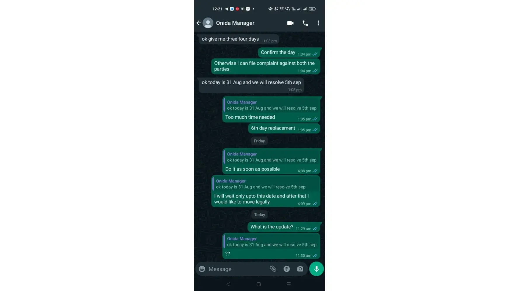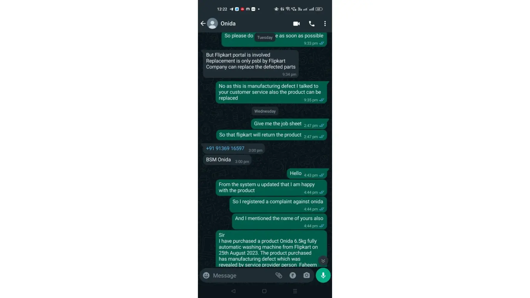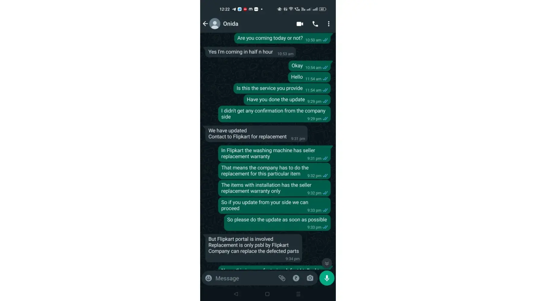 I purchased a Onida washing machine from Flipkart on 25th August.The product find defective from the day of installation and the service provider person Faheem chowdary told that the company will provide replacement and he went back.After that I contacted flipkart and since the product has 7day Seller replacement warranty they redirected me to Onida. I talked with the Manager and he also told that they also speaking irresponsibly