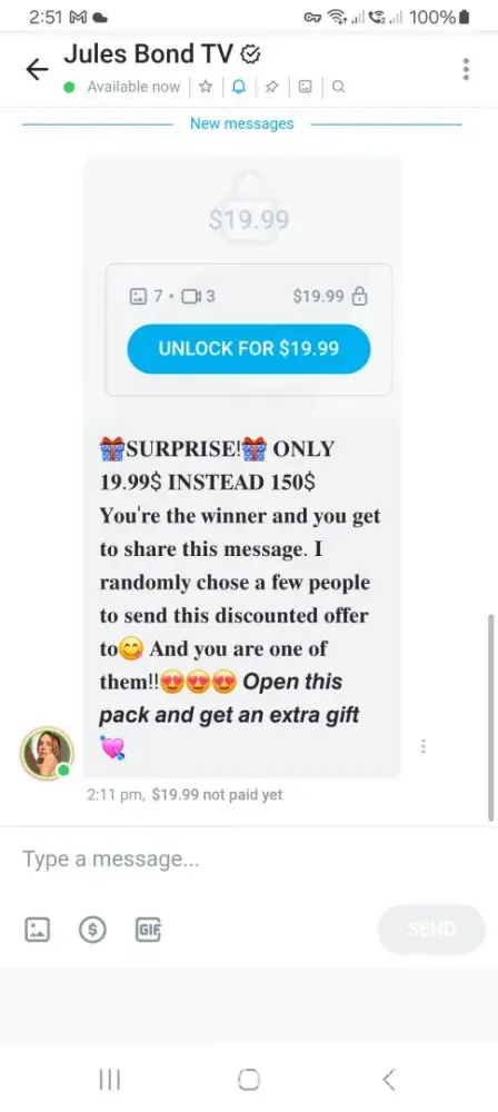 Just another scam by yulia or sheisbond. It must be good not having a proper full time time and posting rubbish like this in pvt messages on onlyfans, who really don't care and its all about profit. You pay $19 to get her already posted photos or someone else has paid for to then get a perfect discount to her paid page which subscribers are paying $12 per month a total rip off. Avoid like the black death. Another Ukrainian/ Eastern European com artist like valeriia ovchinnik or belle.ann and Sweetbelle-ann