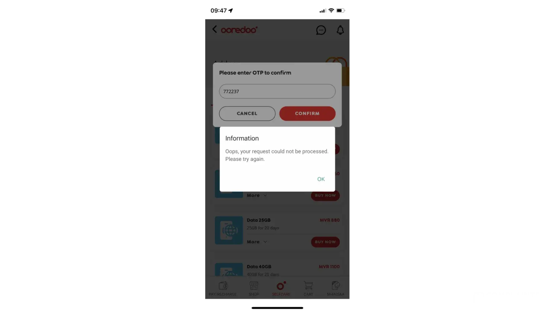 I tried to purchase the 12GB but it kept on saying "Your request could not be processed" At this stage I was a bit frustrated to put it lightly. I then contacted the customer care again. They requested to restart my phone, same problem persisted. I contacted them using wifi but it disconnected for some reason and so data usage was deducted from my credit balance. They instructed me to try again but now I have about 480MVR and the minimum required is 500MVR. I would need to add more credit again. Now I'm really skeptical about taking this chance because I'm pretty sure that I'll get the same error message again.