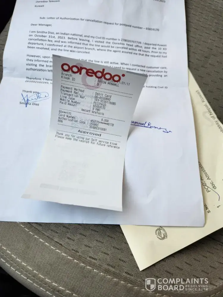 I am writing to express my deep dissatisfaction and concern regarding an issue I am currently facing with the cancellation of my postpaid account. On 29/11/23 I visited the Ooredoo head office in Kuwait to settle all outstanding dues and paid the specified cancellation fee of 10 KD. During this visit, I was assured by the representative at Counter 10 that my account would be cancelled, and there was no need for further payments.