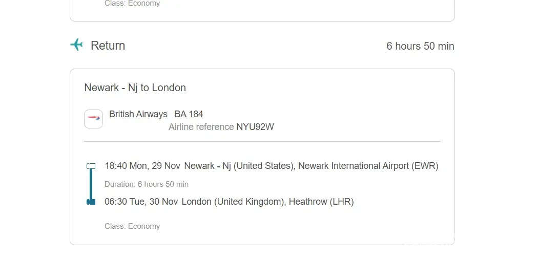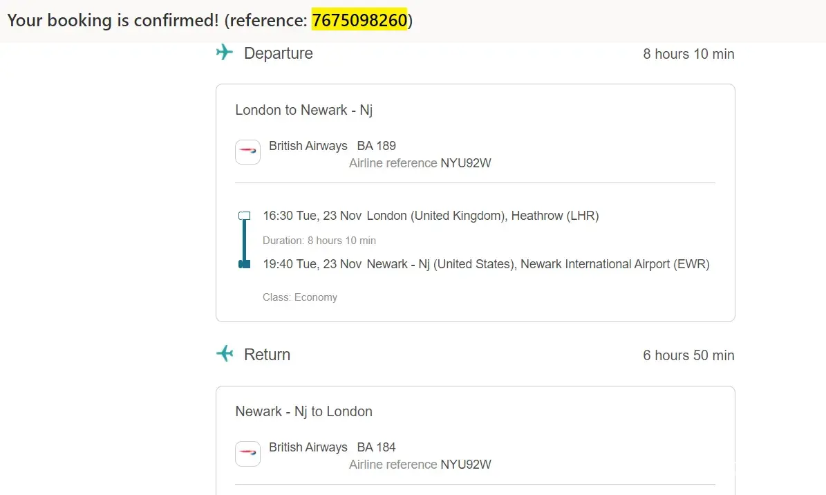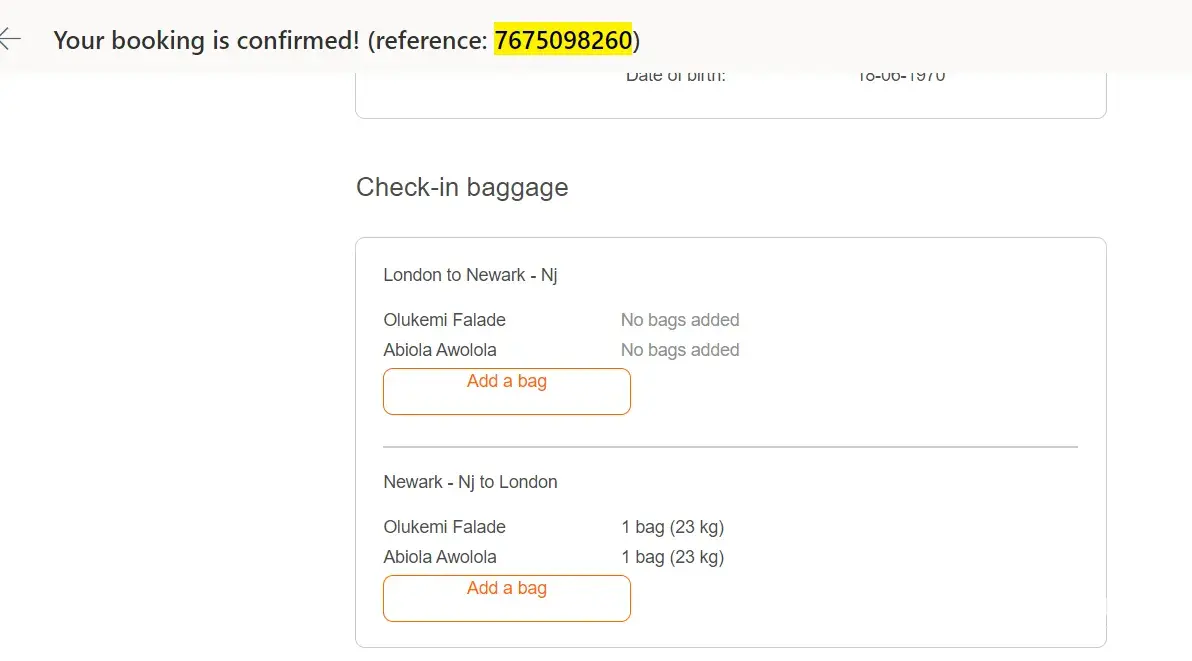 A flight was booked for November 15th, 2021, for two people travelling to Newark, America @ £848.59 including extra 23kg each to check in.