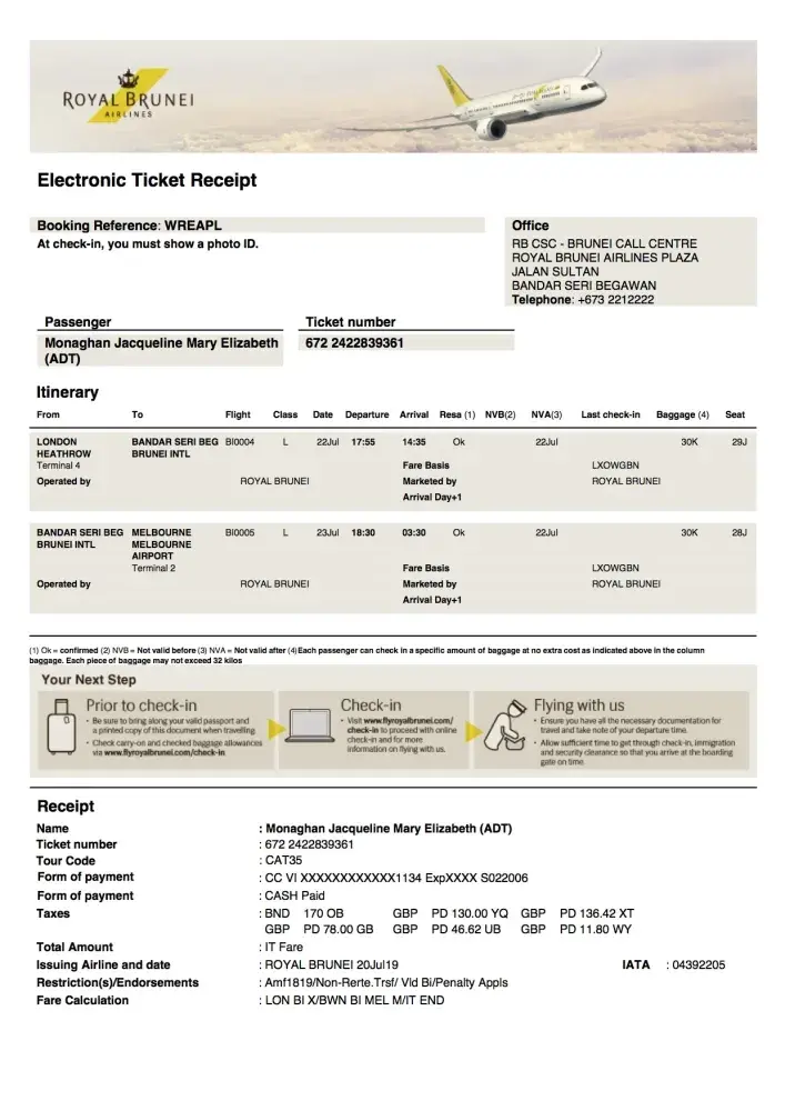 22/23 July 2019 London Heathrow, via Brunei to Melbourne