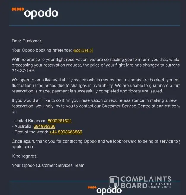opodo booking website issues, customer service, extra costs incurred, etc