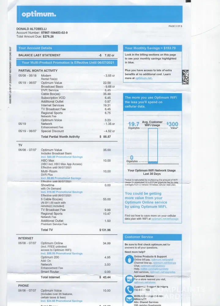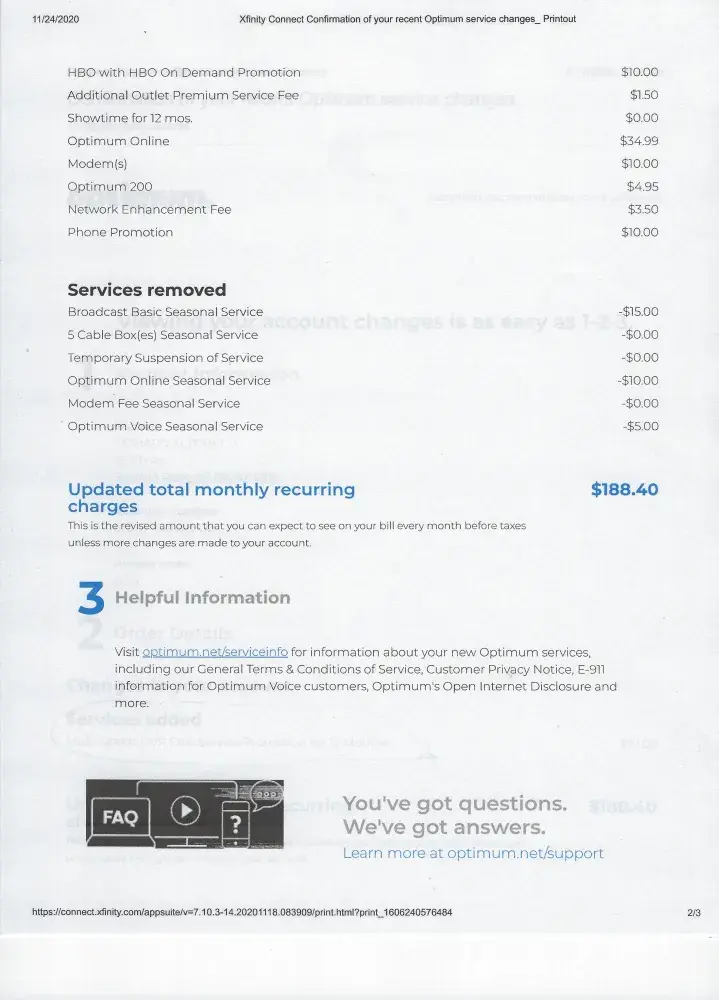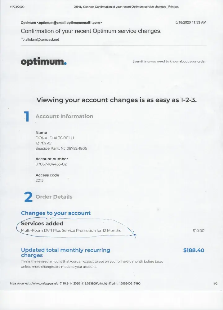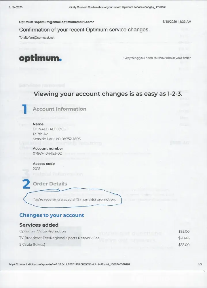 (4) Optimum order number NJ [protected] was completed on November 19, 2020 at 11:00AM by a Optimum service man who