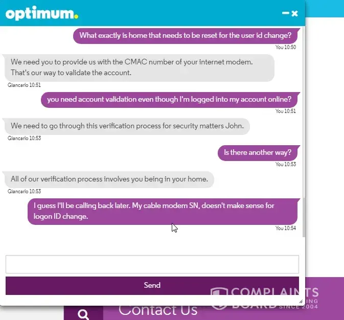 A simple request to change my Logon ID for the Optimum Online account requires me to be home. They request all the hardware serial numbers in order to apparently, validate the account? I was already logged in to my account, and submitted an online chat request, and provided details regarding the account already for them to have access into it (validation enough?), then they claimed an inability to assist because I was not home and able to provide the serial numbers off my optimum cable hardware. Something doesn't sound right when all the request was it to change my logon ID. This is not the first time Optimum has made it difficult to make simple changes to the account. Just another example...