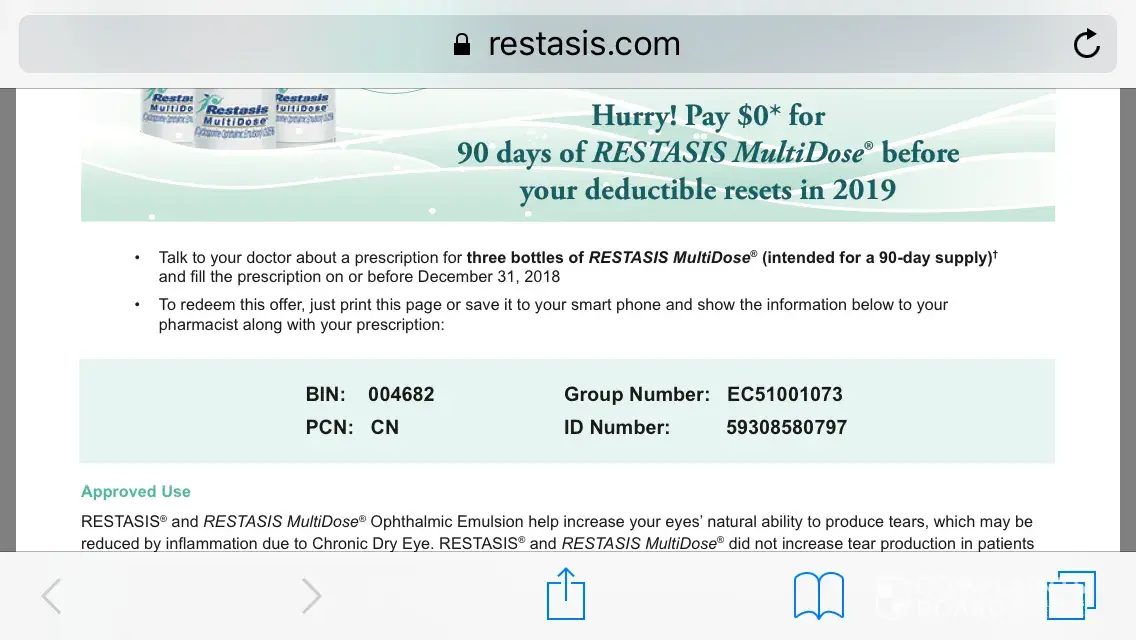 restasis multidose vial 30 day supply. coupon for free 30-90 day.co-pay charged for 3 days