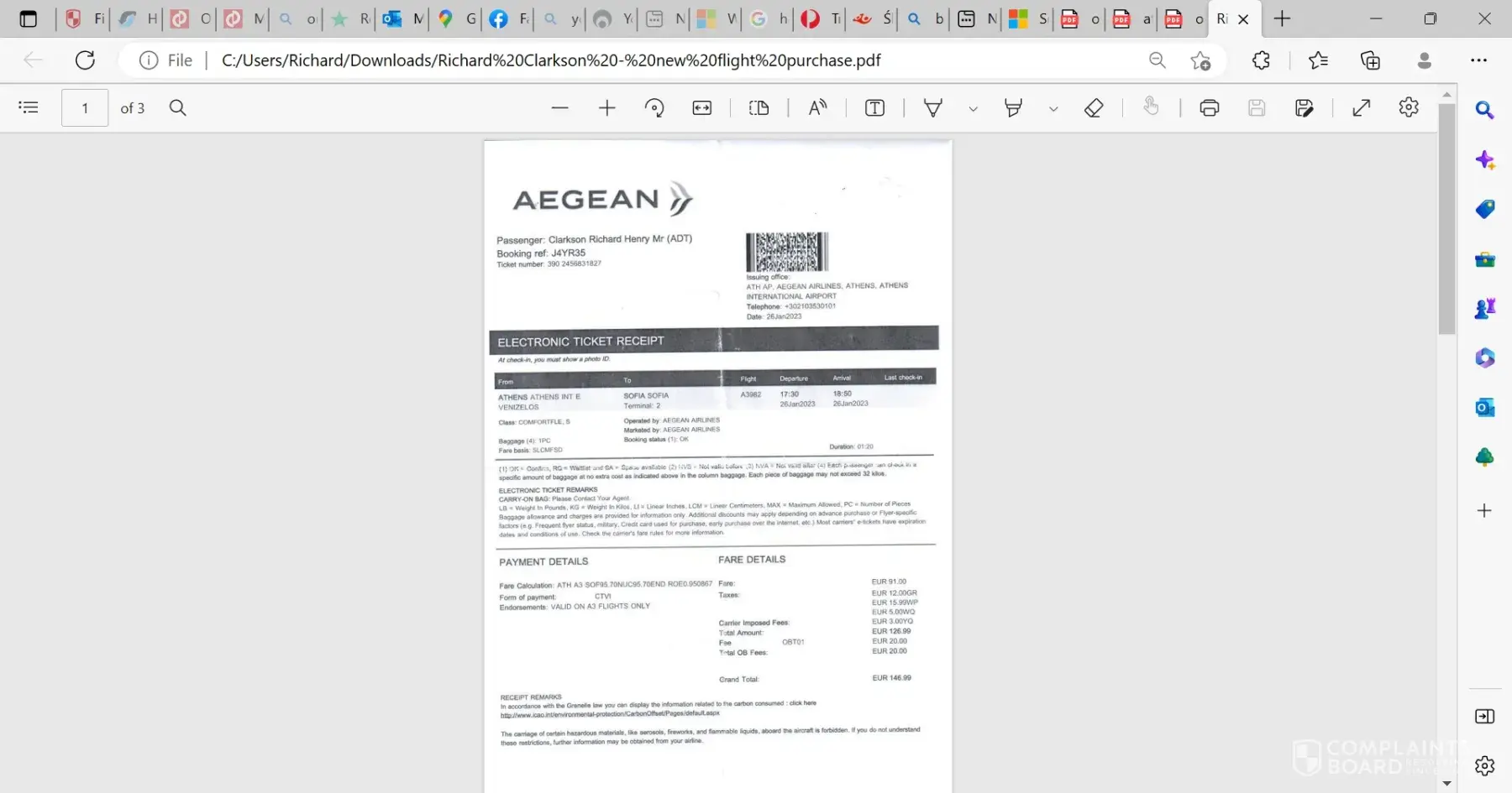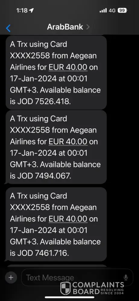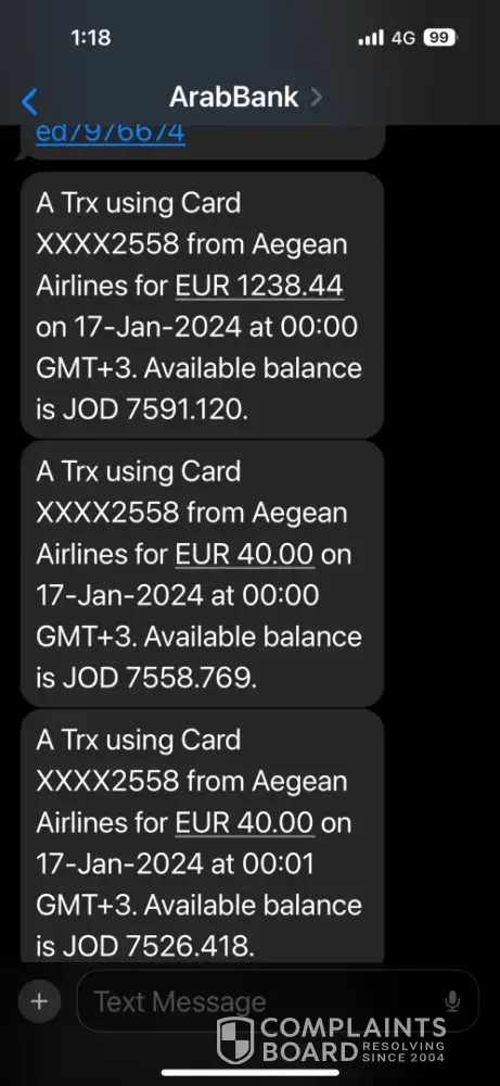 Claimed loss: 6 Credit acrd charges as follows:1) 1127.6 US$ from Royal Jordanian2) EUR 1238.44 from Aegean Airlines for the tickets3) Four charges of EUR 40 for extra bags = EUR 160